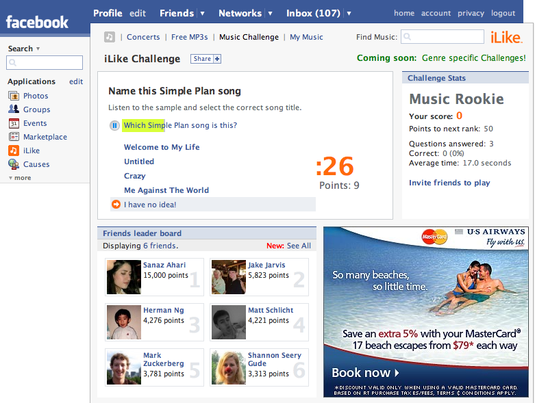 Much of the popularity of the iLike Facebook application is driven by something called the iLike Music Challenge, where users try to guess songs or artist names based on listening to a 30 second snippet from a song. Users get points for correct answers (and more points for fast answers), and compete with their friends. It’s highly addictive and viral – Partovi says the average user session last a whopping 80 songs. Since points are public, I can see that a lot of my Facebook friends are totally addicted to this. See the screen shot below, and click for a larger view.
