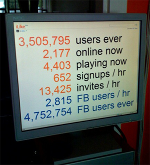 I had a chance to visit music social network iLike’s Seattle offices yesterday to meet with co-founder Hadi Partovi. The first thing I noticed when I walked into the office was a flat panel display showing key real time stats for the company – see image to the right. I took a picture as Partovi looked on nervously. These stats haven’t previously been publicly disclosed, but he agreed that I could publish them.
