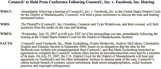 The Facebook/ConnectU litigation is moving ahead steadily – lawyers for both sides are in court today arguing over a preliminary motion to dismiss portions of the case. ConnectU has scheduled a press conference immediately following today’s hearing, roughly scheduled for 3 PM PST. We also expect some sort of statement from Facebook shortly. Stay tuned.