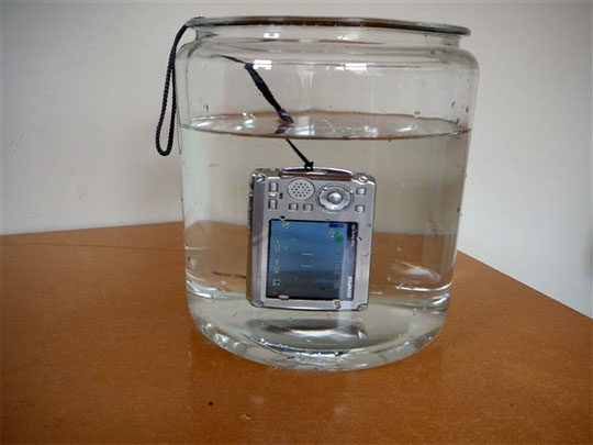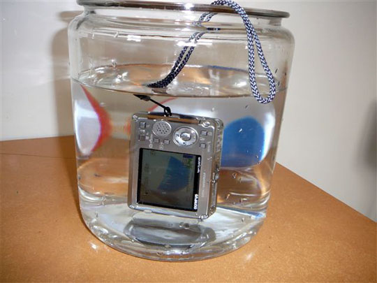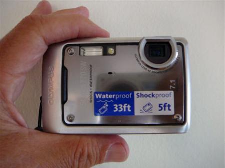 First thing I did was throw it into a swimming pool. I waited a half a minute, took a swig of beer and dove in after it. When I came up, I took a picture of my girlfriend, not bad (my girlfriend), and the camera still worked. The camera is waterproof to a depth of 33 feet.