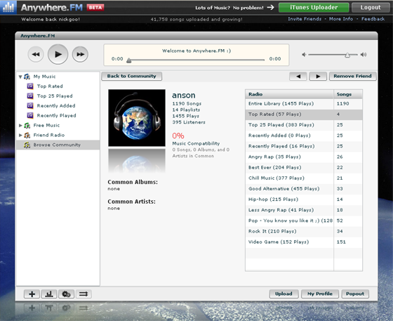 Like a host of other social music startups, Anywhere.fm has also added music discovery features. While not as robust a discovery engine as a Last.fm and company, users can find new songs by listening to their friends’ play lists and will soon be able to find new friends based on a music compatibility score. However, due to copyright concerns, playlists from other users can only be streamed as radio stations. Playlists must be a couple songs long and played in a random order. Although, Anywhere.fm isn’t following official online radio play guidelines like Lala, which require station play lists to be at least three hours long before publishing.