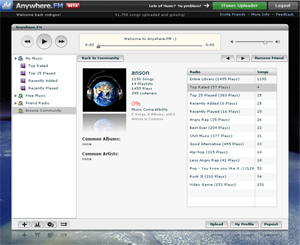 Anywhere.fm has launched a new online music player that looks and feels a lot like a web based version of the iTunes player, sans the music marketplace. Like iTunes, you can load maintain a music library, reorganize your songs into play lists, and veg out to visualizations. Anywhere.fm’s iTunes bulk uploader makes it easy to get up and running with your existing library.