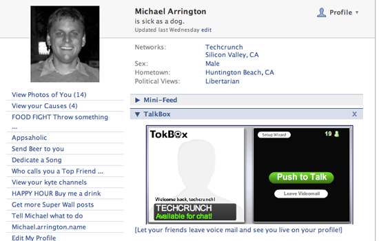 Ryan Merket whipped up a Facebook application that integrates the TokBox chat player.