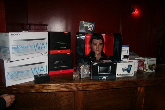 By 9pm we had distributed the majority of our drink tickets, mostly to Josh Goldman, and collected over 100 business cards, mostly from Joost and Joe Gallo from Ketchum PR. After experiencing some technical difficulties we were able to conduct our massive prize giveaway. And in the end, and to the best of my knowledge, everyone walked away properly schnockered and effectively enthused.