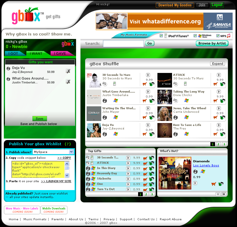 gBox is not only a destination retail site for digital content. It also has an embeddable gift box widget to show off what you want to your friends. Your friends can then buy it for you directly from within the widget. It will be available as a general embed or specialized for 7 of the big social networks (no Facebook). Their current offering, music, will go for 99 cents per track and $9.99 per album (to stay competitive with iTunes). You have to have a gBox account to receive a gift, but not to buy one.