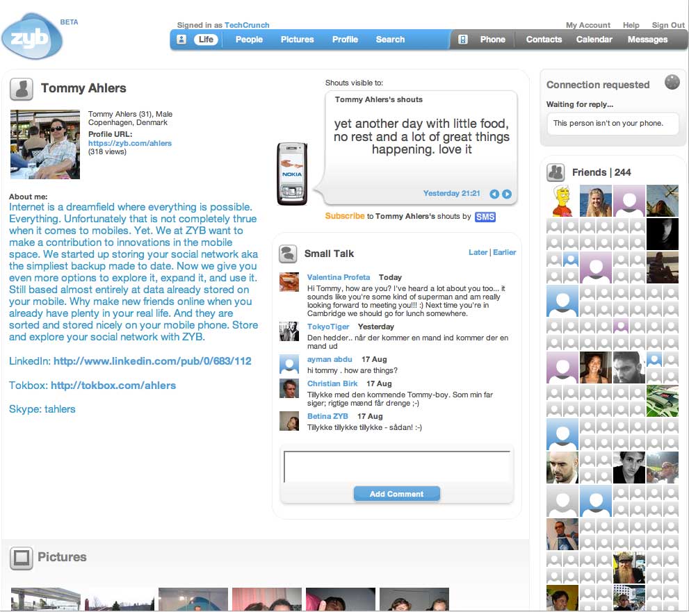 ZYB, realizing that people add most or all of their close friends, co-workers and family as mobile phone contacts, has now built a social network to leverage those connections. You can add anyone on your contact list as a friend, which sends a request to them to add you as well. Users have standard profile pages to add photos, comments, etc. And they can also text/sms in status updates which appear on their profile, and friends can choose to subscribe to those status updates via text as well (very Twitter-like).