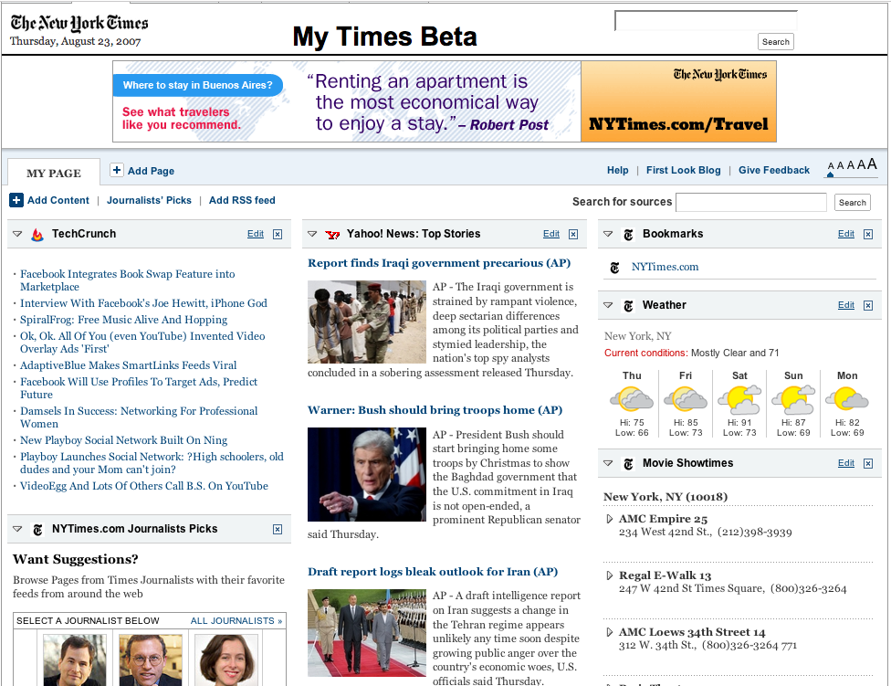 The New York Times took their personalized home page product out of beta today – see it here. The look and feel is about the same as it was a a year ago when it went into private beta – Think MyYahoo, Pageflakes or Netvibes, with the New York Times logo and without the widgets.