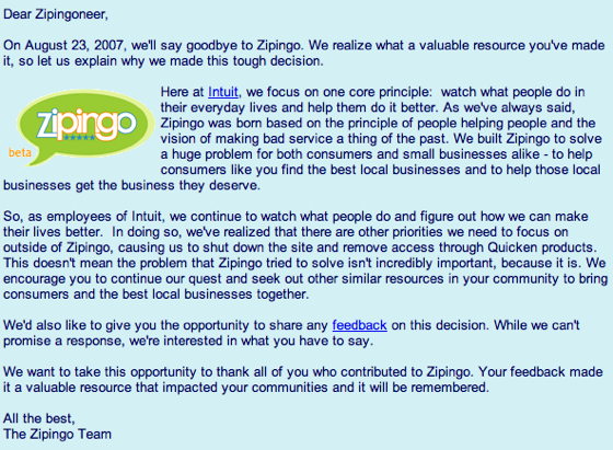 Zipingo, the small business review site launched by Intuit in late 2005, shut down yesterday.