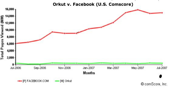 U.S. Comscore data shows, as expected, barely a blip from Orkut (Facebook shown for comparison). Orkut has 425 million monthly page views compared to 15 billion for Facebook: