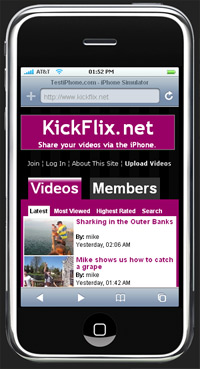 KickApps has created a test network (pictured above) at KickFlix.net to demonstrate how formatting and video playback works on the iPhone. While not terribly pretty, this demo lists videos and members in a way that fits nicely into the iPhone’s smaller screen. Unfortunately, the company did not also format the actual video and member pages for the iPhone. This oversight makes me wonder how easy it will actually be for affiliates to create CSS files that make all of their networks’ pages fit the iPhone.