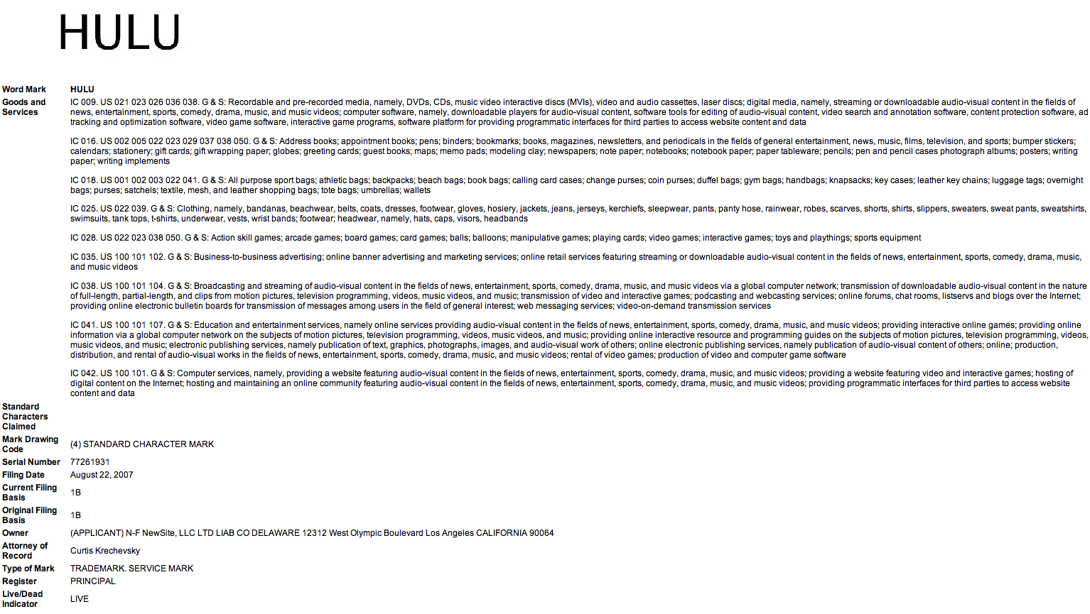 The parent company behind the Hulu joint venture, N-F NewSite, LLC, filed a U.S. trademark application (this is an image capture, you can search for the trademark on USPTO.gov but links time out) on August 22 for the term “Hulu”. Trademarks only apply to businesses that companies actually engage in, which means that others can use the trademarked name in unrelated businesses.