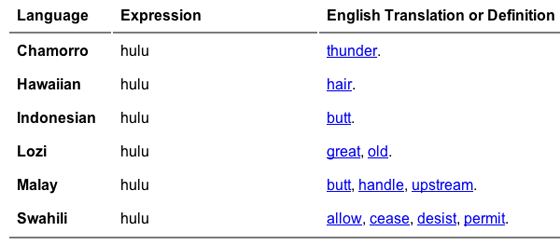 Hulu means “butt” in both Indonesian and Malay. But that’s nothing compared to Swahili, which 80 million or so people speak in sub-Saharan Africa. In Swahili, Hulu means, among other things, both “cease” and “desist.” See here as well.