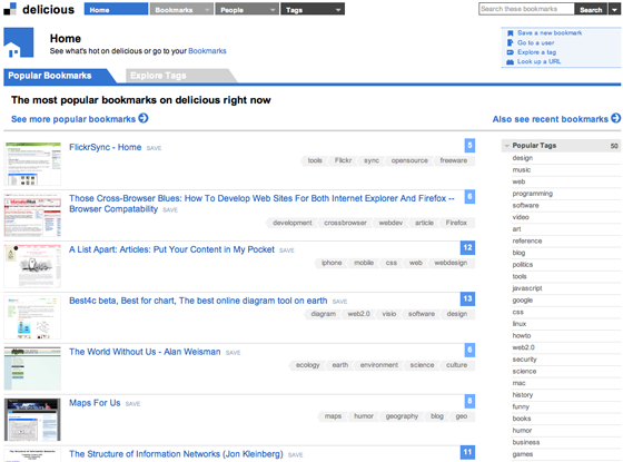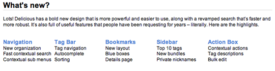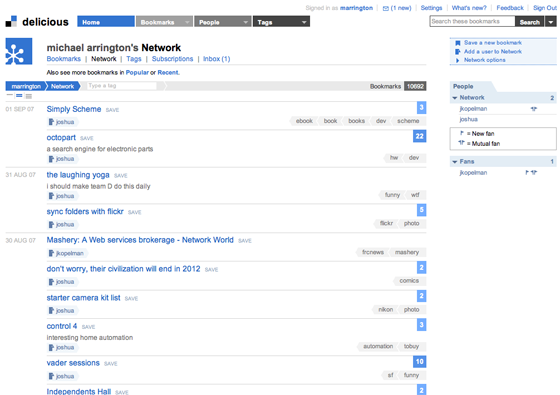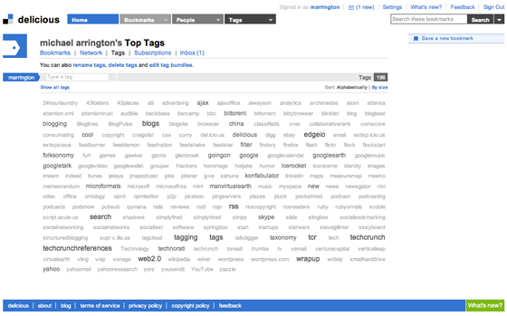 The navigation bar is now organized into Bookmarks, People, and Tags. The tags section features a new MyTags page where you can see all of your tags in an expanded cloud. On the bar, you can search bookmarks amongst your own, networks, everyone’s, or the set you’re currently looking at.