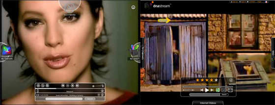 Last week the second Joost look-alike popped up: DNAStream. Like the first Joost clone, created by Paul Yanez, it basically appropriates the Joost look and feel and presents it in a web browser through a Flash interface (Joost itself is available only as a download). Unlike Yanez’s version, DNAStream is presenting itself as a business and doesn’t talk about Joost at all. DNAStream is shown above on the right, next to Joost.