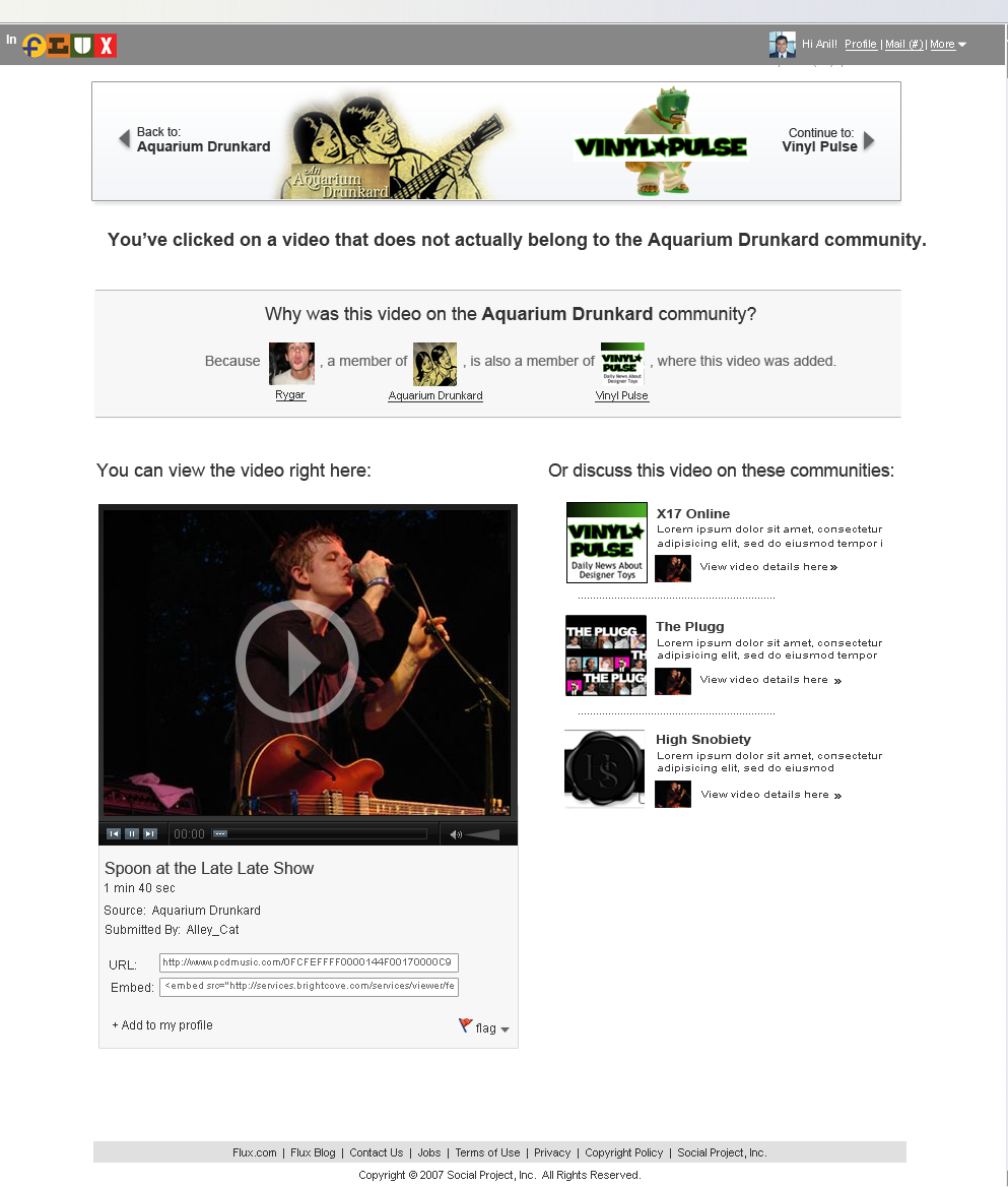 But Flux really is a network of networks. While it is most like Ning, the walls between the Flux networks are very porous – uses drag content (photos, videos, etc.) between sites, perhaps grabbing a video from the 50Cent site and presenting it on their profile at the MTV site. While each community has distinct branding, the individual users see groupings of brands that they enjoy under a single profile.