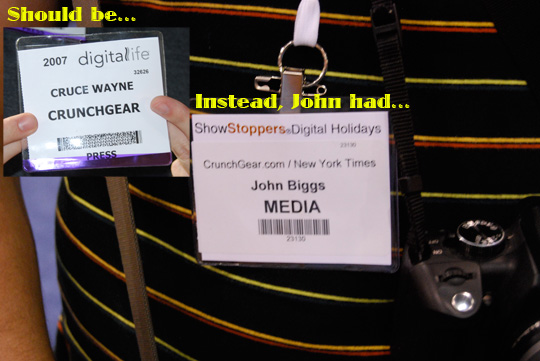 We totally laughed at John’s expense at Digital Life today. Last night there was a press event called ShowStoppers, totally unrelated to Digital Life. Similar stuff, sure, but completely different show. Someone noticed that all of our Digital Life badges were different: I have “Crunch Gear,” Vince has “CrunchGear,” Peter has “CrunchGear.com,” Blake has “Crunch Gear.co m” (the “m” went down to the second line) and what does John have?