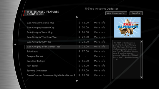 The first functionality of U-Shop will be enabled with HD DVD release of Evan Almighty. With Universal U-Shop, viewers have the opportunity to shop for items from the movie right from their living room. Consumers can access the entire store from their HD DVD player and start purchasing exclusive items from titles that offer this feature.