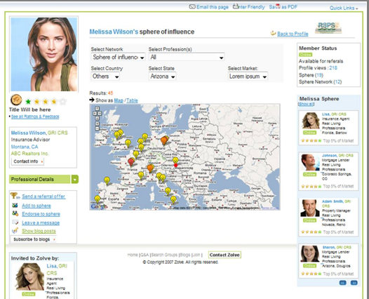 Here’s how he proposes Zolve will work: Brokers and other real-estate professionals (like title insurance agents, inspectors, etc.) across the country will be able to create profiles on Zolve and connect to their professional peers across the country. By clicking on their “sphere”of influence, they will be able to see every other Zolve member on a Google Map who is connected to them by two degrees of separation. The whole point of the site is to generate referrals between real-estate professionals. A broker can get 25 to 30 percent of a commission if she refers a customer to another broker. This is done all the time within the industry, especially if a potential home buyer is looking outside the first broker’s immediate geographical area of expertise. For example, a broker in San Mateo might sends business to another broker in Denver,and collect a referral fee of a few thousand dollars if the customer ends up buying a property there.