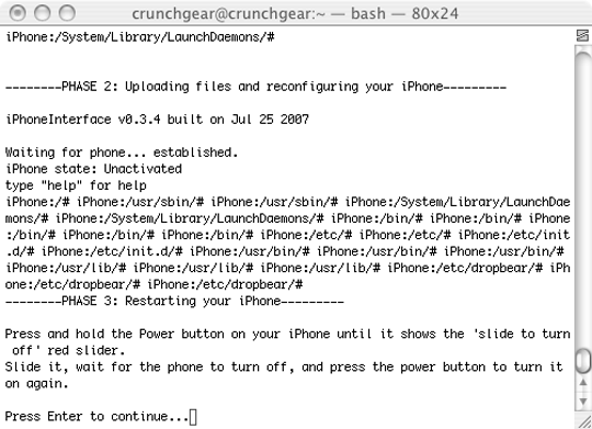 Well, I spent about three hours playing with the phone and I feel confident this one will stick — as long as I don’t reboot the phone. However, I am missing all the third-party hotness and find this a Phyrric victory at best. iTunes doesn’t like the iPhone right now and it seems to be in some sort of limbo mode between activated and deactivated that works but is far from ideal. My advice right now is to not upgrade. It’s just not worth the “GAH!” factor once you realize how much work it is to keep up the 1.1.1 facade.