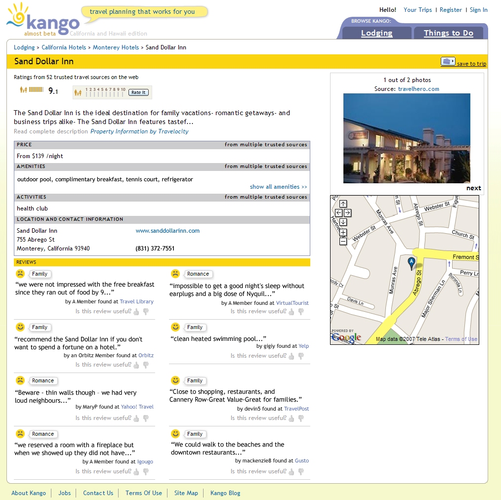 But what’s promising about Kango is the way it slices up search subjectively. Kango is building a semantic search engine focussed narrowly on travel. It parses the language in all of those reviews and guides, and categorizes them by generating tags for them. “You cannot wait for users to add tags, you have to derive them,” says CEO Yen Lee. So hotels that have been reviewed across the Web (on sites like Yahoo Travel, TripAdvisor, or Yelp) with words such as “perfect,” “relaxing,” “couples,” “honeymoon,” or “spa” would rank higher in a search for romantic travel. Hotels associated with the words “kitchen,” “pool,” and “kids,” would rank higher in a search for family trips.
