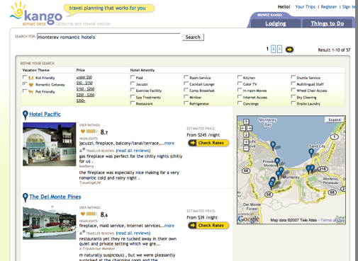 The startup, which has been in stealth-mode until now, does manage to add a new twist to search travel. It is indexing 18 million opinions and reviews across 1,000 travel-related sites to derive the best travel search results based on what type of trip you want to take. If you are planning a romantic getaway in Big Sur, you will get one set of results. If you specify that you are looking for a family outing instead, you will get another. Or you can look for pet-friendly hotels and activities. Of course, you can also search by price or amenity, like any other travel site. And you can see where each hotel or activity is located on a small Google Map.