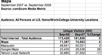 But MapQuest still has the biggest market share, and that share is not yet declining (see chart). Given all the innovation going on with online maps these days, that market share is extremely vulnerable. Now MapQuest will be based on a new technology architecture that hopefully will allow it to respond more nimbly to the incredible diversity of map features and applications that are out there. Still, don’t expect it to do anything too crazy. It’s got 50 million mainstream users that it does not want to alienate. My prediction is that it will remain very much focussed on driving directions and other routing applications, which is its strength. I don’t think we’ll be seeing too many geo-tagged videos on MapQuest. Instead, it will deploy Web 2.0 features to improve its core mapping functions and deepen the loyalty of its existing users. Imagine how grateful they will be when they realize they no longer need to be stuck with a user interface from 1999.
