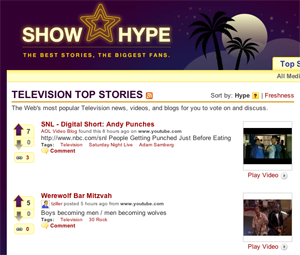 ShowHype: The newest of the bunch – it launches this evening. This is from the same Silicon Valley- based startup that launched BallHype in April. Users can see top news on the home page or drill down to keep track of specific movies, television shows or celebrities, all based on tagging.