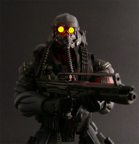 Shockingly, this post is not about Halo 3. Instead, I’d like to bring to your attention a Killzone action figure that pays attention to details. Modeled after the Helghast from the game, this one-of-a-kind model comes from custom crafter Jim Saotome. And in case you were wondering, yes, those eyes light up.