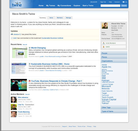 CEO Nova Spivack took me through a demo. On the surface, Twine is a place to organize information you find or create on the Web—bookmarks, notes, videos, photos,contacts, tasks. (A Web browser plug-in makes it easy to save stuff to your Twine wherever you may find it on the Web). You can also share that information with a private group or publicly. Once you ingest in all the information you want to organize, Twine applies a semantic analysis to it that creates tags for each document or video or photo. The tags match up to concepts that Twine’s algorithms associate with each piece of content, regardless of whether that concept is specifically mentioned in the Web page or other content being tagged. For example, you might bookmark this post and Twine would create tags for all the people mentioned in it (Nova Spivack, Paul Allen, Peter Rip, and Ron Conway). It would also create tags for the organizations related to the post, such as Radar Networks and DARPA, but also Paul Allen’s venture firm Vulcan Capital—even if Vulcan was never mentioned in the post.