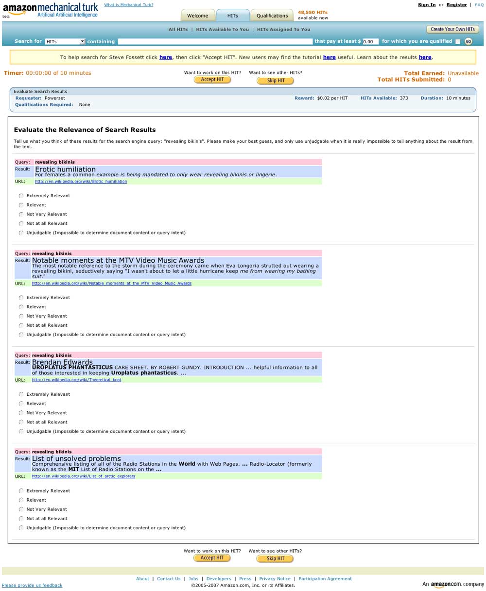 See the screen shot (click for larger view) – users are shown a query and a number of results and are asked to evaluate the relevancy of each result from five choices. In this case, the query is “revealing bikinis.” Users are asked to evaluate four sets of results within ten minutes, and are paid $0.02 for the effort.