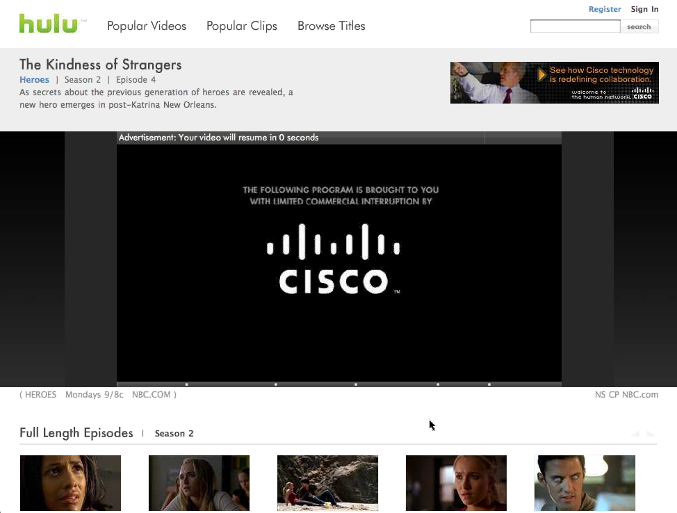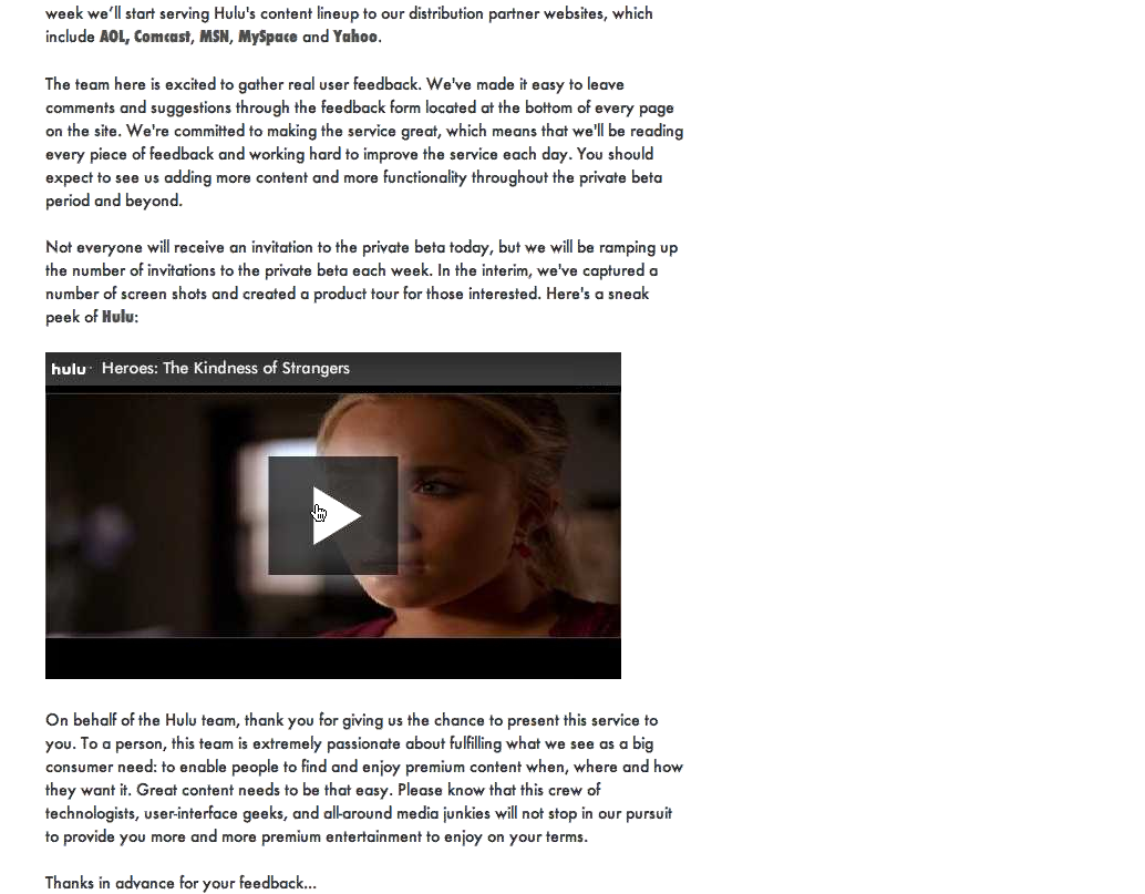 Hulu is still a joint venture exclusively between NBC Universal and News Corporation. It exists as a website through which users can stream a collection of TV shows, movies, and short clips on-demand for free without any limits on how many times you can view each video. Hulu also exists as a distribution network of premium content for several partner websites – AOL, MSN, MySpace, Comcast, and Yahoo – that will display Hulu’s videos for free but in their own branded players. In addition to these partnerships, users themselves form a viral distribution network of sorts since Hulu allows its videos to be embedded in any website and shared via email. Hulu makes money in all cases from advertising, which it displays in and around the videos it serves. I’ll go more into the details of embedding and advertising later on.