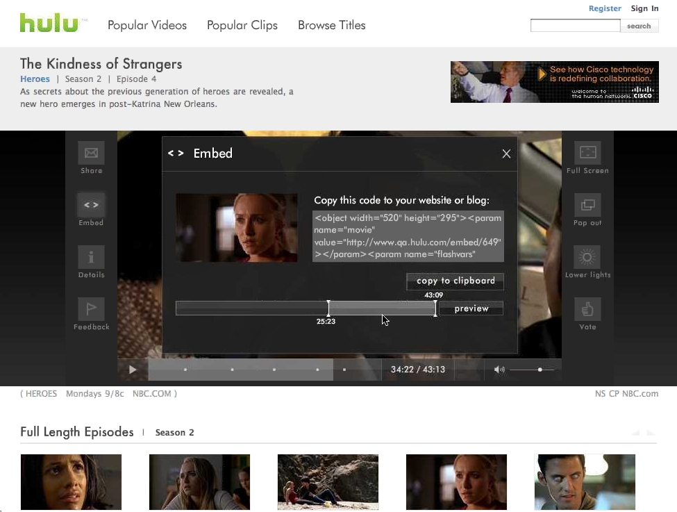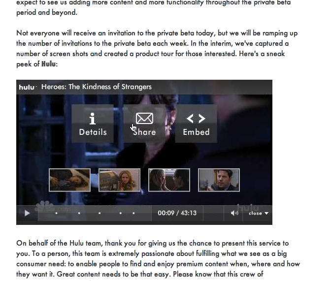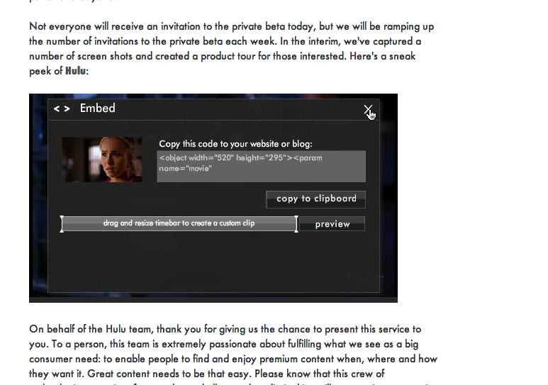 The videos themselves are streamed at either 480kbps or 700kbps depending on your bandwidth, and Hulu is working with Adobe to provide even higher resolutions through Flash Player 9.2 by the end of the year. Hulu’s video player sports all the basic features we see in embeddable players these days: sharing via email, embedding via HTML, video details, full screen, seeking, and volume. It also has buttons with which users can submit feedback directly to Hulu, pop the video out into its own window, darken the rest of the page for better viewing, and vote the video up or down. Perhaps the coolest feature of the player is the ability to select just a segment of the video to share with friends or embed on your website. Embedded videos have fewer features, but users can still share and embed videos that have already been embedded, which should really help to spread Hulu’s videos virally (and make it less popular to embed low-quality versions hosted on YouTube). But, again, if the embedded video expires or is replaced with new content that the embedder did not choose, that could end up backfiring on Hulu.