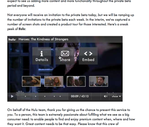 Behind all of this criticism was a high degree of doubt that NBC and News Corp. were ever going to get Hulu out the door before the joint venture became irrelevant. In September, NBC had even announced a video downloading service that appeared to cannibalize its own joint venture with News Corp. However, this past week Hulu confirmed that it would indeed hit its self-imposed October deadline by launching in private beta on Monday, October 29th. And this past Friday, CEO Jason Kilar and other Hulu representatives demonstrated the new service to us.