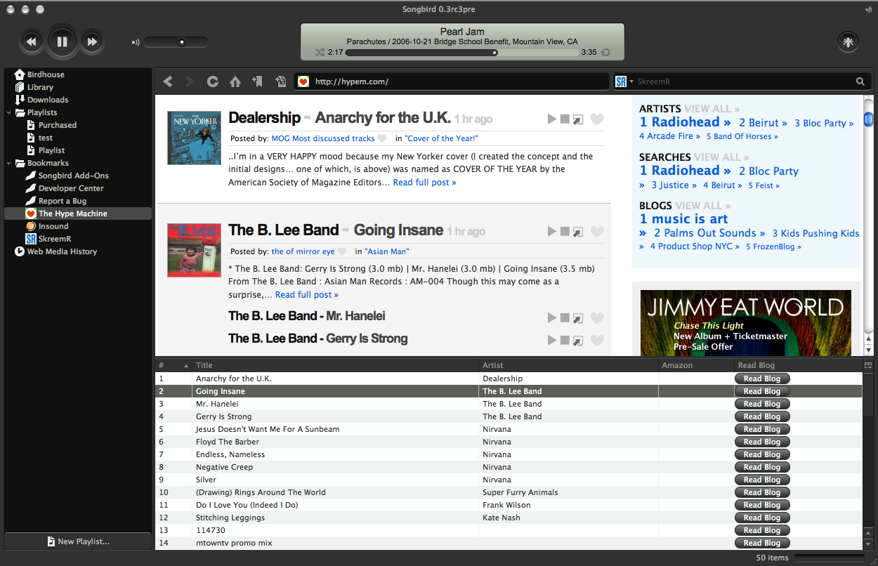 The Hype Machine, Insound, and SkreemR have programmed their websites for Songbird and are packaged with the latest release. A screenshot of the player I saw on their website also suggests that an iLike integration is in the works.
