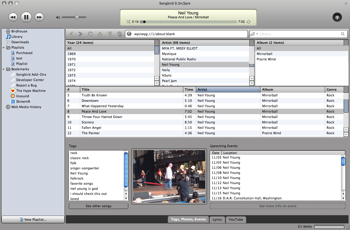 Now suppose you’re a media company that wants to set up shop within users’ media players the way Apple has set up shop within iTunes. You could try to hack together a plugin for iTunes, but you won’t get the same results and you’ll be subject to the whims of proprietary software. With Songbird, you have access not only to a fully-equipped desktop media player but also a set of open APIs with which you can easily mesh your existing website with Songbird (see developer center). For the most part, developers just need to program their websites to take advantage of a Songbird DOM object in JavaScript. You can also build themes and plugins for Songbird as you might for Firefox, since the application’s architecture is fundamentally the same.