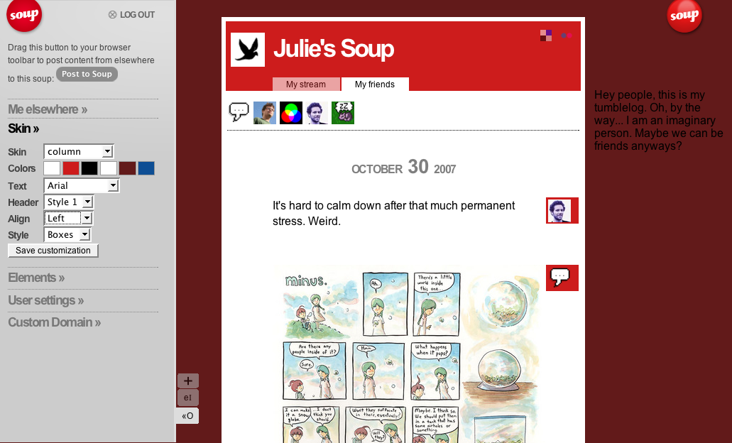 Soup.io is very low friction take on life streaming that serves as an aggregator for a lot of your public social media feeds. There are a lot of startups trying to do social aggregation (Spokeo, ProfileLinker, MyLifeBrand, Fuser). Paul Buchheit’s highly automated FriendFeed looks like one of the best so far, but Soup.io is another easy to use alternative despite being manual.