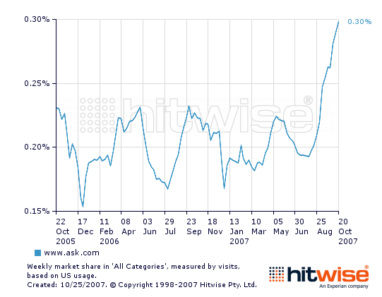 At least Ask is not losing market share. According to comScore, the search market share of Ask’s network as a whole nudged up 0.2 percent in September versus August to 4.7 percent (compared to 57 percent market share for Google, 23.7 percent for Yahoo, and 10.3 percent for Microsoft). Both Google and Yahoo still gained more share in September than Ask.com, although it did take some share away from Microsoft. And if you look on Compete.com, traffic to Ask.com itself does look to be picking up.