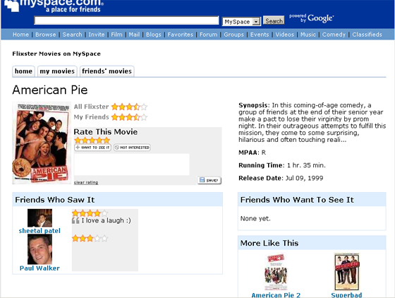 We’re seeing a Flixster application on MySpace now through the OpenSocial APIs. Flixster says it took them less than a day to create this. I’ll add screen shots below.