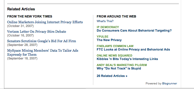 Last night, the New York Times quietly launched Blogrunner on the technology section of its main site. Blogrunner was one of many techmeme copycat sites, until the New York Times bought it last year. Like Techmeme, Blogrunner is a service that keeps track of the latest news and blog posts on a range of topics (Politics, Technology, Media, Business, Economy, Law, Health, Movies, Books, Religion, Iraq, Entertainment). Now those links are appearing on the New York Time’s main site, starting with the technology section, in a middle column titled “Technology Headlines from Around the Web.” It is also on the bottom-right of the Health section in a column called “Health Around the Web.” And links from Blogrunner will appear at the bottom of individual stories, giving readers a choice between related articles from the New York Times and related articles from around the Web (much like some sites use Sphere).
