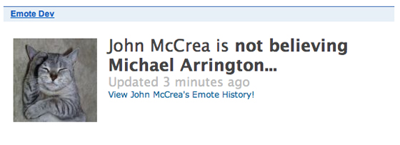 In an email, McCrea said he added all of the emoticons himself and his account doesn’t appear to be hacked. But when I asked theharmonyguy to hack my Plaxo account he did, within minutes, adding four quick emoticon messages such as “michael arrington is getting my bling on” and “michael arrington is w00t” (see image to left, none of those were added by me). theharmoneyguy then added one more to McCrea’s account, which will be difficult for him to deny: