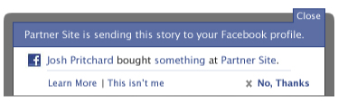 At the point of sale on the third party site, the user will see a “toast” popup asking them if they approve the sale information being included in their Facebook News Feed: