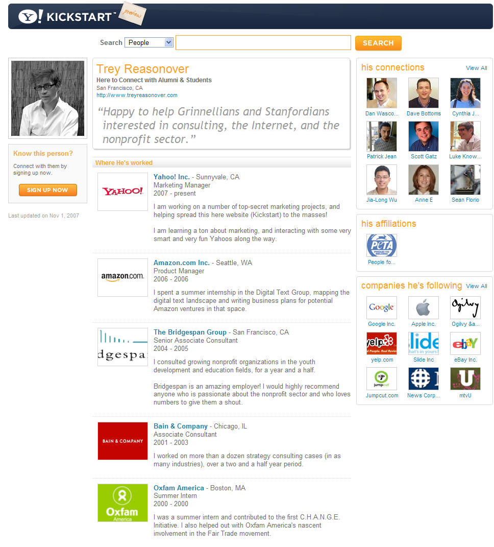 What I liked about the service when I saw a demo last week was the possibility to find a deep database of individuals that went to the same schools that I did. And this clearly isn’t a place for pictures of partying and drinking – the whole point is to build up a professional network to help you move your career along. For young students just getting out of college this can be a very useful service. And they can keep having fun on Facebook…while pointing potential professional contacts to their Kickstart profiles.
