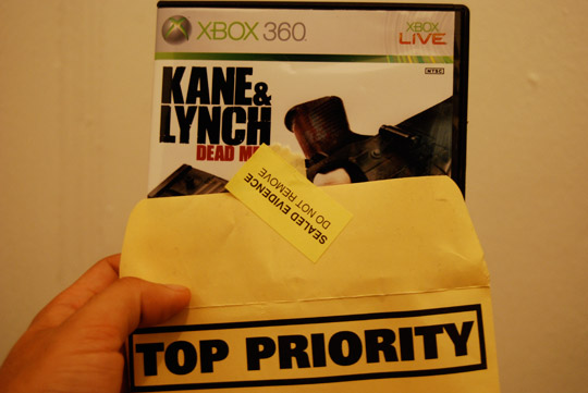 Not that anyone cares, but I nearly had a heart attack yesterday. Not because I was robbed or anything like that, but because I got a package in the mail. There’s an Eidos game coming out by the name of Kane & Lynch: Dead Men. Specifically I don’t know what it’s about—two men named Kane and Lynch, dead presumably—but the packaging it came in really freaked me out. I open the UPS box and it’s got official looking “YOU’VE BEEN SERVED, PREPARE TO BE THROWN IN PRISON” labels all over it.