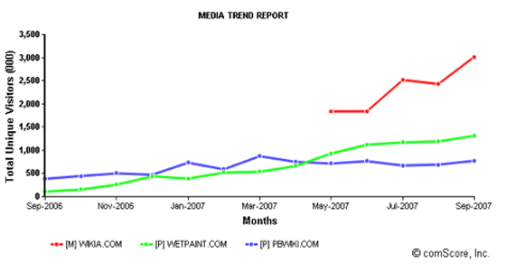 The hosted wiki space is crowded, and Wetpaint competes with Wikia and PBWiki, among others. Comscore shows Wikia in the lead with over 3 million monthly uniques, followed by Wetpaint with 1.3 million and PBWiki with 770k (Wikipedia, of course, is the 800 pound gorilla, with 228 million unique monthly visitors):
