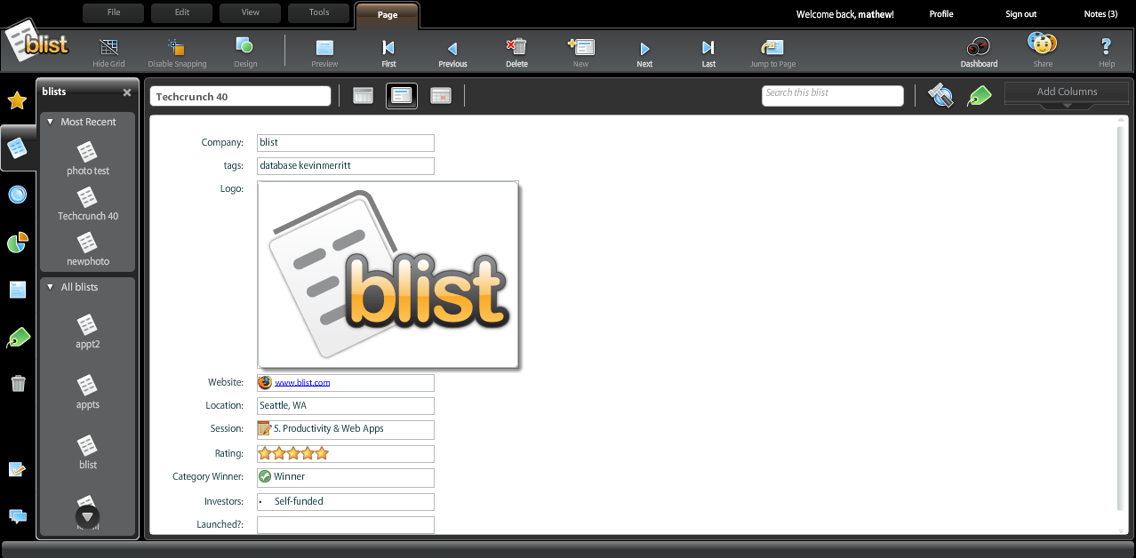 I recently had the opportunity to see a demo of a product coming out in early 2008 called Blist (pronounced like “bliss” with a “t” at the end) that will take on DabbleDB and Trackvia by giving users the tools to easily create and manage databases online.