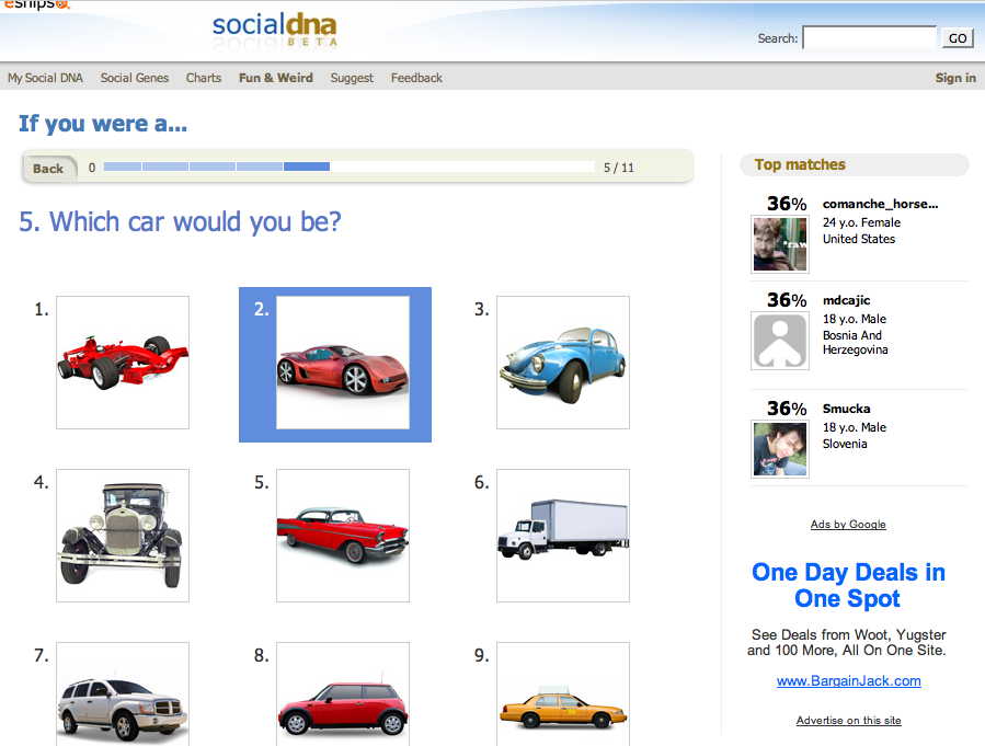 Social DNA then takes these two sources of input and compiles percentages meant to reflect how similar you are to others on different topics. You’ll find out that you and Sally are 64% alike in political beliefs but only 8% alike in musical tastes, etc. The site will also tell you who you match most closely in a particular community or group of friends.