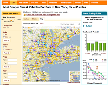 Depending what category you are looking in there are also lots of helpful geographical sliders and other suggested ways to parse your search (by breed, for pets; by make, price, year or mileage for cars; by neighborhood, square feet, or amenities for real estate; by gender, sexual preference, marital status, smoking habits, hair color, and zodiac sign for personals). Oodle surfaces comparative pricing information in a handy graph for categories where it has enough data, such as cars. (The average price for a used Mini Cooper in New York City, for example, is $18,132 and the 2007 models show the steepest price declines). It also gives an inventory forecast—”We found 258 listings and expect 35 more next week”—based on historical patterns. Most search results can also be seen on a Google map. .