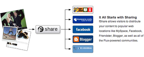 Today Flux launched the first key part of their platform called fshare. In general its a way for sites with video content to allow users to share that content by placing it on other sites. See the 50Cent site for an example, and click on any of the latest videos on the bottom left of the page. Then click on the fshare button. You can then add the video to various social networks, or just add it to your list of favorite content. Friends from any Flux network will then be able to see that content in your “news stream” and add/share it themselves.