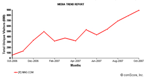 Flux is certainly similar to Ning (which by the way continues to grow rapidly, see Comscore chart). But the approach is different. Ning is drawing lots of users who are creating brand new networks, perhaps tangentially related to existing brands. Flux is all about taking existing sites, even big ones, and turning them both into social networks as well as part of a bigger network of networks. Both might do well – Ning has momentum, but Flux has huge existing partners right out of the gate due to the Viacom relationship.