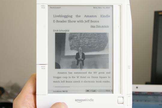 Bezos: The convenience of having your newspapers pushed to you full text—newspapers and blogs—is fantastic. People will understand the subscription charge is essential to cover the wireless delivery. 99 cents a month for a blog, a third of the cost of a latte? To get the wireless convenience of having that blog resident on your device and updated at all times? [Ed.’s note: Some blogs, like TechCrunch, are $1.99 a month. We remain skeptical that anyone will pay for these, but hope to be surprised].